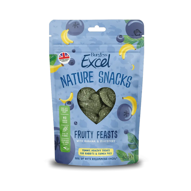 Bagte med kærlighed er vores Excel Fruity Feasts uimodståelige for kaniner og marsvin. Uden tilsat sukker eller kunstige farver eller smagsstoffer er de også naturligt sunde! Burgess Excel Fruity Feasts er et supplerende foder til kaniner og marsvin.