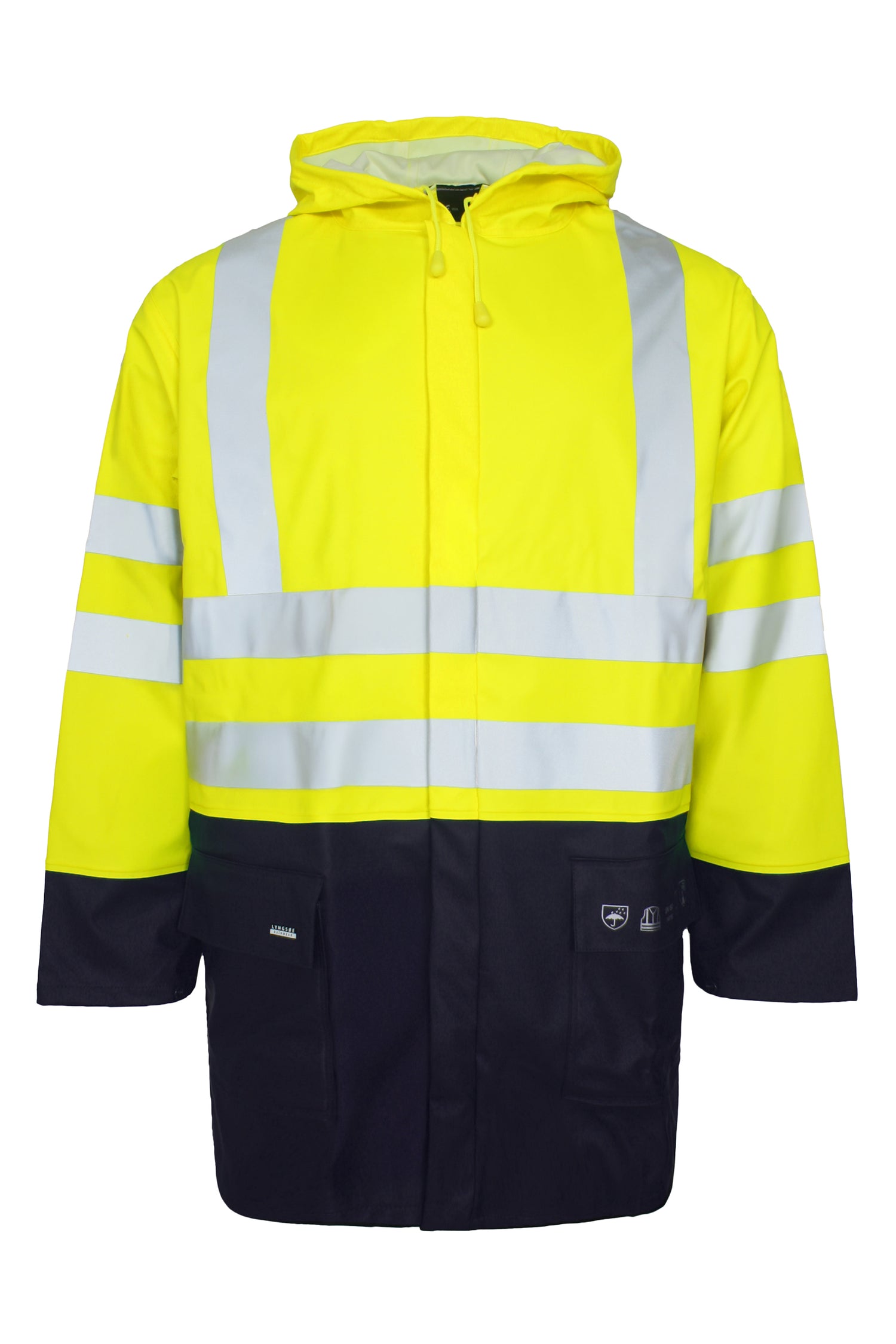Brandhæmmende Hi-Vis regnjakke i kraftig PU kvalitetSaturn Gul / Navy - Lyngsøe Rainwear