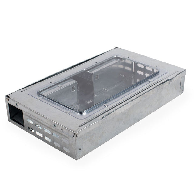 Fælde fremstillet i galvaniseret jern og med stort gennemsigtig plastik låg, hvilket gør det nent at se, om der er mus i fælden.