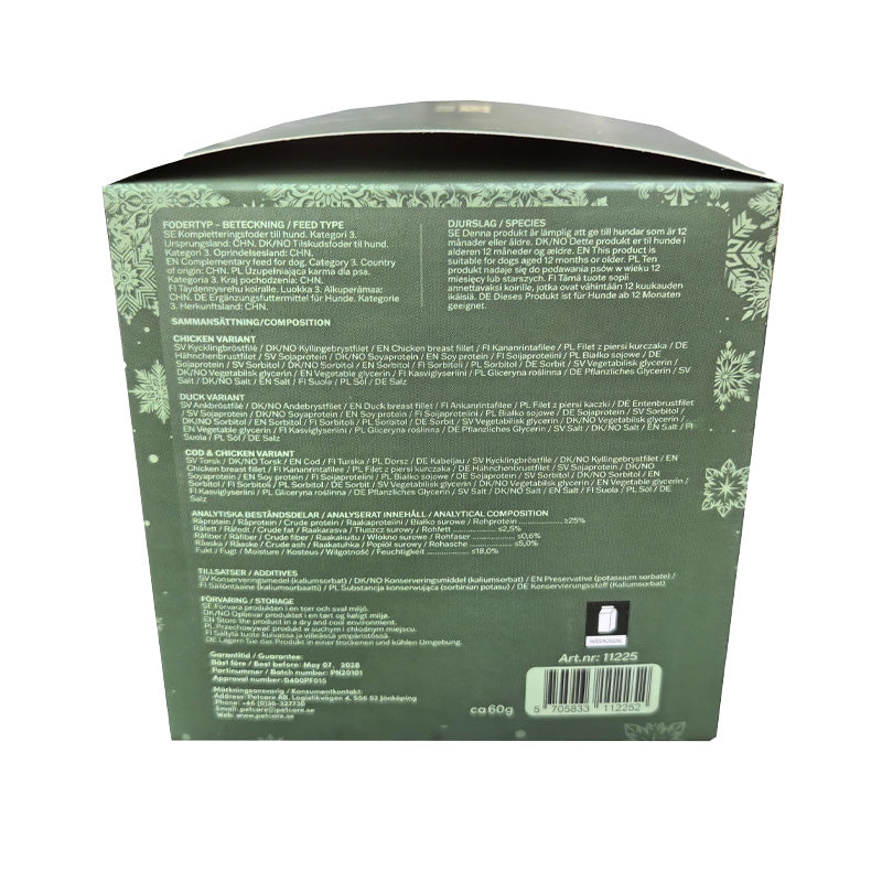 Vores stilrene julekugle er tilbage i 2025! Indeni kuglen gemmer sig en lækker overraskelse til din hund, som med garanti vil få halen til at logre. Kuglen indeholder godbidder med smag af kylling, fisk og and – en perfekt kombination af dekoration og velsmagende belønning til din firbenede ven i juletiden!