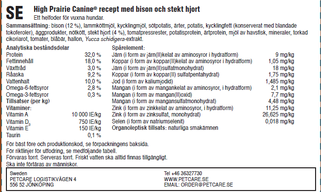 Taste of the wild High Prairie indeholder 32% råprotein og 18% fedt.