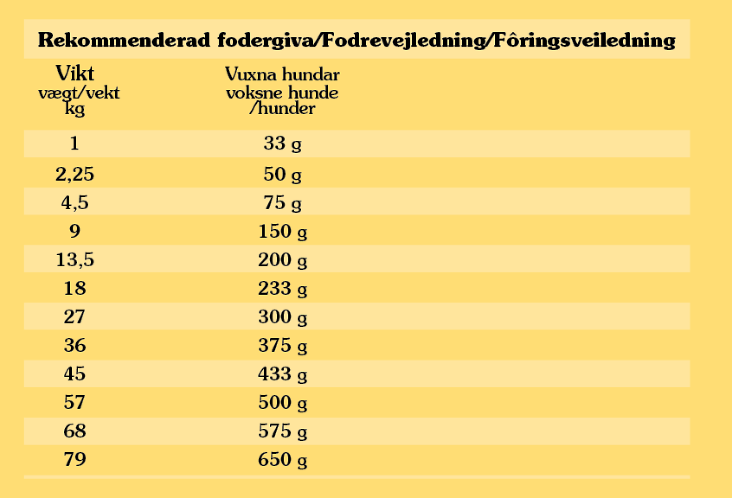 Næringsindhold: Råprotein 32,0% Fedt 18,0% Råfibre 3,0% Vand 10,0% Zink 150 mg/kg Selen 0,4 mg/kg Vitamin E 150 IU/kg Omega-6 fedtsyrer 2,8% Omega-3 fedtsyrer 0,3%