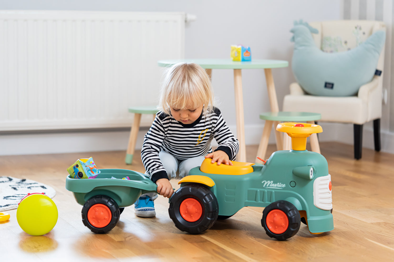 Maurice er en sød lille traktor fuld af tricks! Han følger dit barn fra 12 måneder. Med sin trailer, skovl og rive er han den ideelle ledsager til havearbejde eller sandkassen. Den er også en fantastisk kilde til opvågning med sine flotte farver, lille lydnøgle og retningsbestemte rat med horn, der udvikler fine og grovmotoriske færdigheder. En lille følgesvend, der hylder 75 års knowhow, samtidig med at han ser fremad mod fremtiden for vores små. Maurice er lavet af mere end 90% genbrugsplast og er helt fremstillet i Frankrig med lige så meget kærlighed, som du giver til dine små!