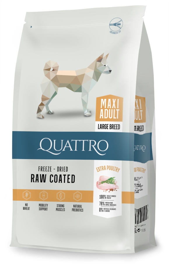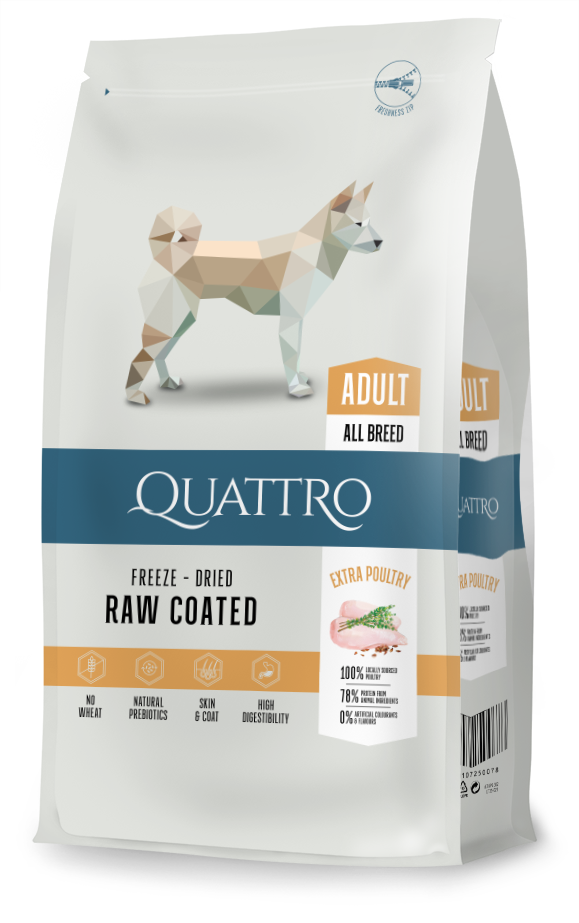 Et super premium foder til voksne hunde af alle racer og størrelser. Foderkulene i QUATTRO hundemad er dækket med frysetørret kylling, hvilket bevarer deres naturlige smag. Dette hundemad vil tilfredsstille selv de mest kræsne firebenede gourmeter.
