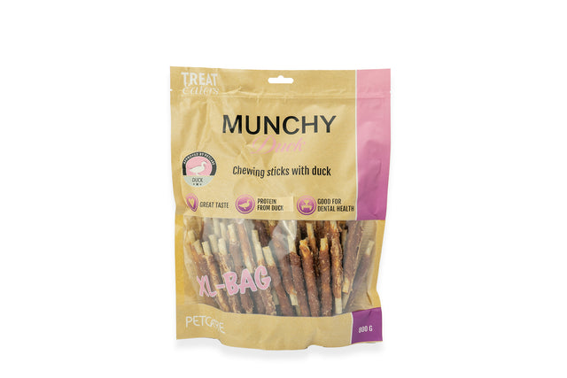 Munchy Stick er en lækker kombination af malet, presset råhud med ris i midten, snoet med udsøgt andebrystfile. Denne velsmagende snack understøtter hundens mundsundhed og giver en tilfredsstillende tyggeoplevelse. Hvert ben er ca. 13 cm langt – en sund og lækker belønning, din hund vil elske.