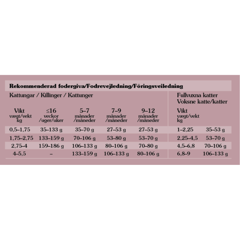 Opbevares køligt og tørt. Efter åbning skal resterende mad opbevares i køleskab i en lukket beholder og anvendes inden for 72 timer. Alle katte skal altid have adgang til frisk drikkevand.