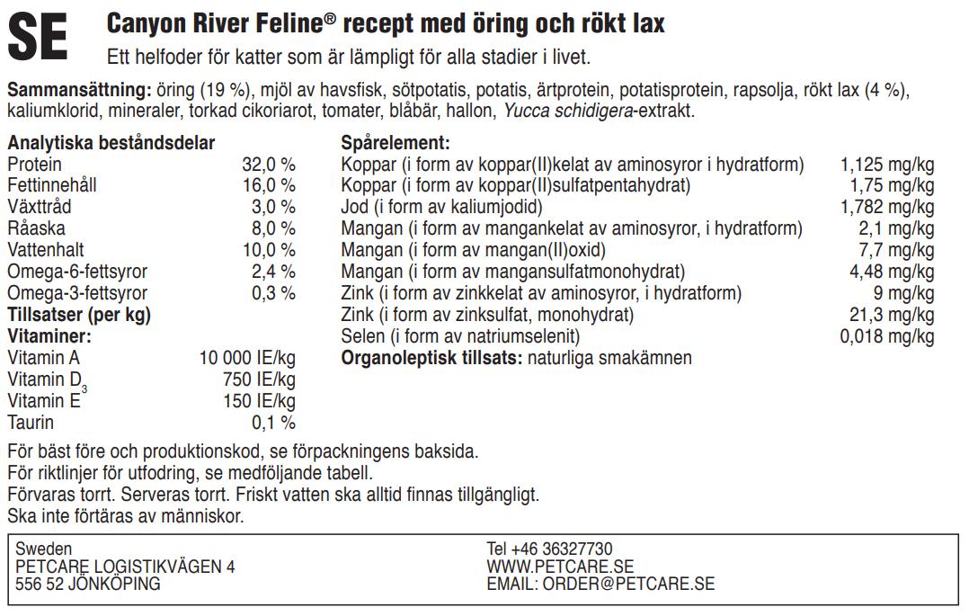 Canyon River er et foder med ørred der tilbyder en smagsoplevelse som ingen anden. Det indeholder også kartofler og ærter, der giver en masse energi til din aktive kat. Foderet suppleres med frugt og grøntsager. Denne velformulerede formel giver naturlige antioxidanter, der styrker din kats immunforsvar og generelle sundhed. Et foder med en smag af naturen. Smag af floden Wild Canyon indeholder 32% protein og 16% fedt. Ingredienser: Ørred, havfiskmel, søde kartofler, kartofler, kartoffelprotein, rapsolie, røget laks, mineraler, tørret cikorie rod, tomater, blåbær, hindbær, frysetørret Yucca schidigera juice. Analytiske ingredienser: Protein 32,0% Fedt 16% Ash 7,4% Fibre 3% Fugt 10% Calcium 1,6% Fosfor 1,1% Næringanalyse A-vitamin 10.000 IE / kg D-vitamin 750 IE / kg Vitamin E 150 IE / kg Jernprotein 60 mg / kg Kobberproteinat 7,5 mg / kg Jernsulfat 60 mg / kg Kobbersulfat 7,5 mg / kg Kaliumjodid 1,8 mg / kg Manganprotein 15 mg / kg Manganoxid 15 mg / kg Omega-6 fedtsyrer 2 , 4% Omega-3 fedtsyrer 0,3% Kalorier: 3.745 kcal / kg (390 kcal / cup) Beregnet vedvarende energi.
