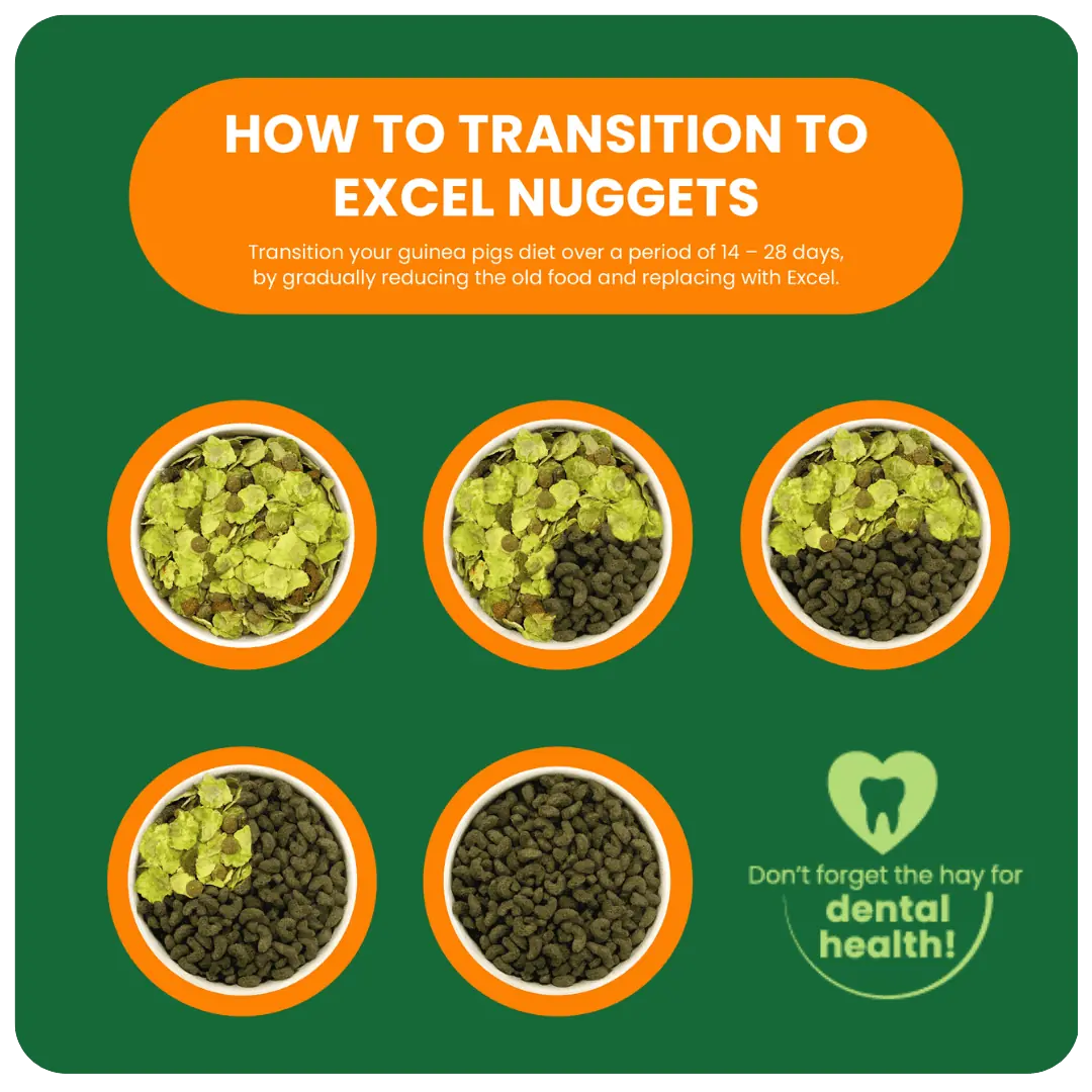 Marsvin bør også få en lille portion Excel Nuggets, lejlighedsvis en Excel Nature Snack for variation og berigelse, samt en lille håndfuld bladgrønt hver dag. Friskt, rent vand skal altid være tilgængeligt. Tal med din dyrlæge for yderligere information.