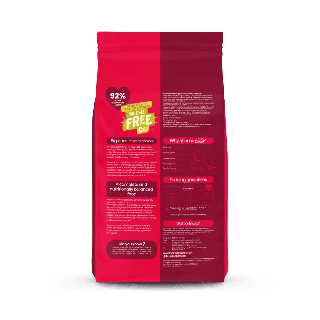 Burgess Excel Rat Nuggets er et fremragende, komplet foder til rotter, som – sammen med en konstant forsyning af rent, frisk vand – giver dine rotter alt, hvad de behøver for at holde sig glade og sunde.