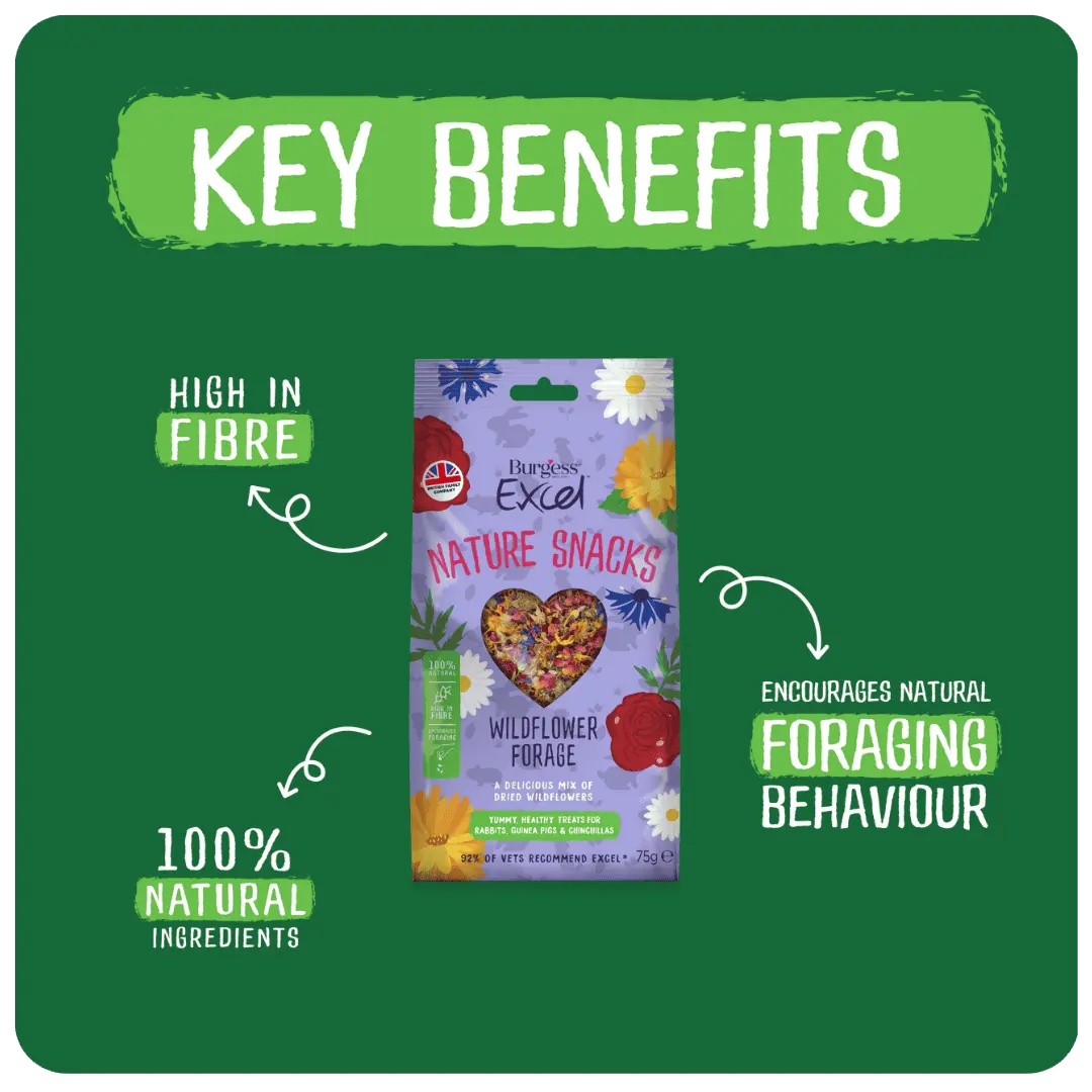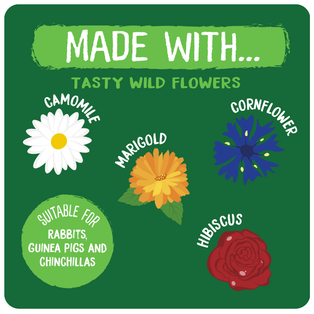 Kærligt fremstillet er vores lækre blanding af vilde blomster uimodståelig for kaniner, marsvin og chinchillaer – og naturligt sund. Lavet med en fristende blanding af rose, hibiscus, morgenfrue og kornblomst er Burgess Excel Wildflower Forage et supplerende foder til kaniner, marsvin og chinchillaer.