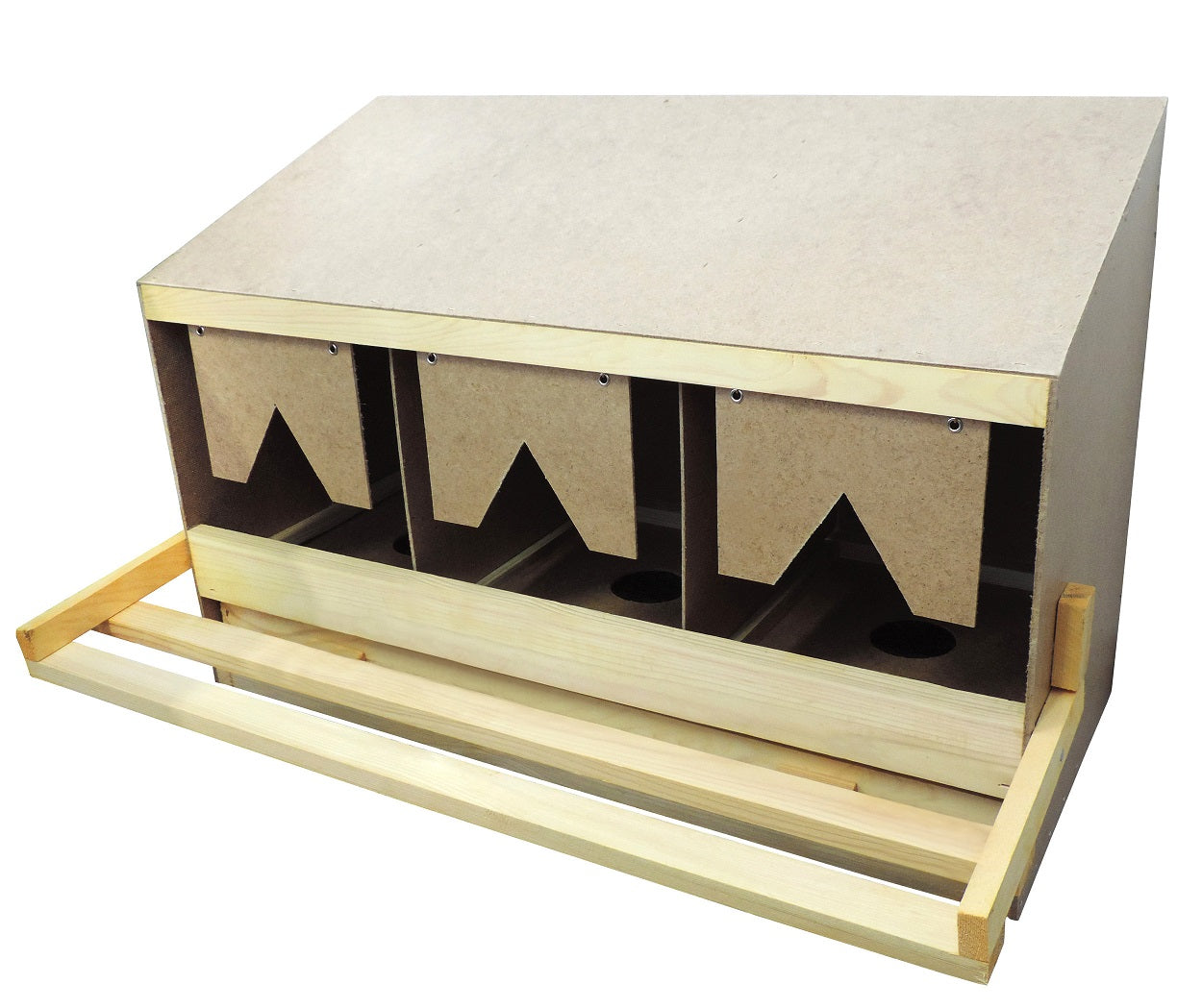 Hønserede fremstillet i hård massonit plader og træ. Specielt til store racer.Æggene forsvinder straks ned i en skuffe under reden. Derved undgås snavsede og ituslåede æg. Denne 3 rums rede er beregnet til ca. 15 høns i store racer. Total mål: L 90 x H 65 x D 44 cm.Leveres inklusive måtter. Leveres både med skrå og flad tag således rederne kan bygges sammen i flere etager.Æggeskuffen trækkes ud på forsiden, men der er mulighed for at vende æggeskuffen, således man kan trække skuffen ud fra bagsiden.