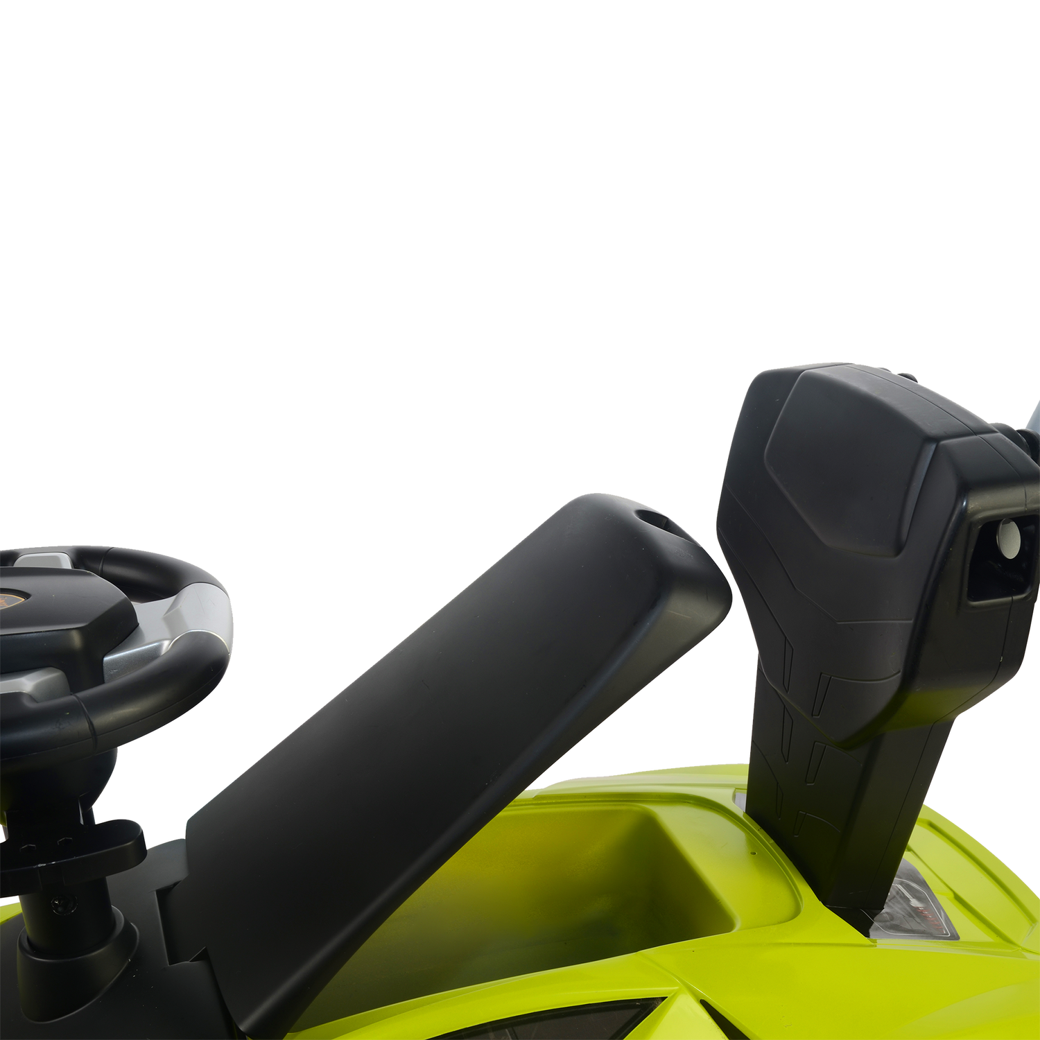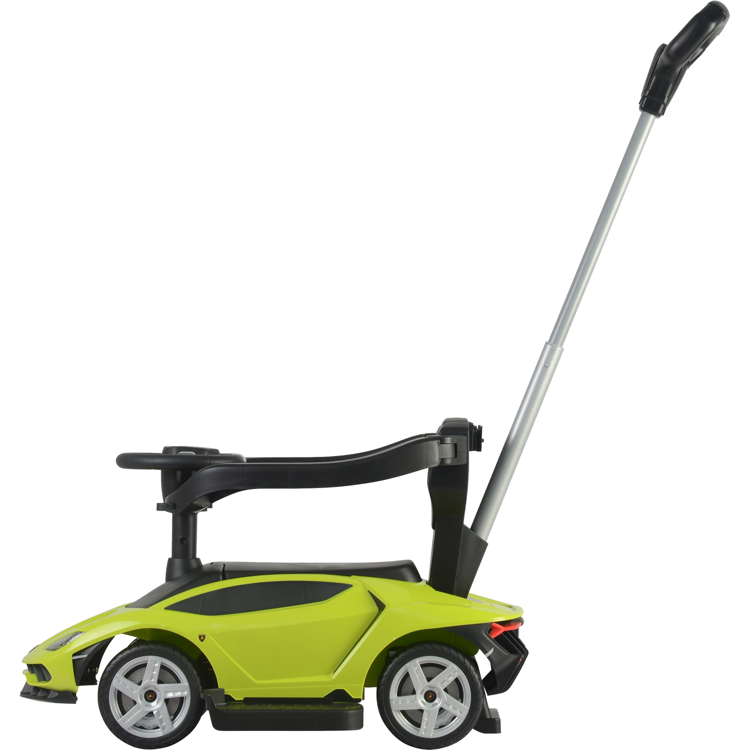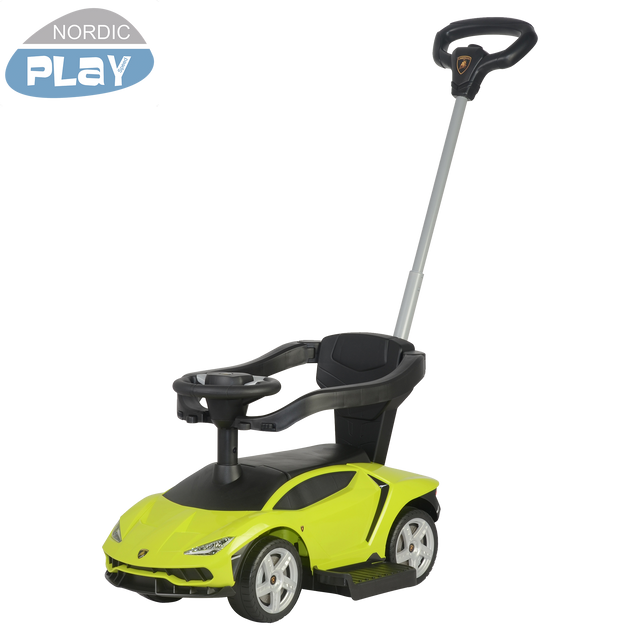 Smart Lamborghini Centenario NORDIC PLAY gåbil på licens. leveres i en fræk grøn farve. Inkl. skubbehåndtag, ryglæn, fodstøtte, armlæn, og der alle kan tages på og af efter behov. Rattet kan afspille musik ved at indsætte 2x1,5V AA batterier. (ikke inkluderet).