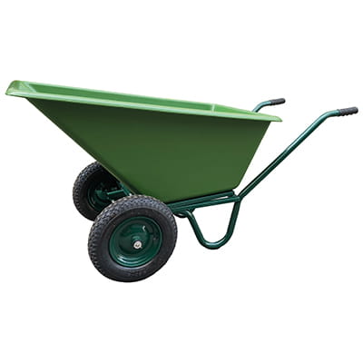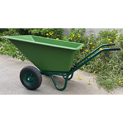 Kærren er fremstillet med en holdbar plastkasse og en robust ramme af pulverlakeret stål, og de luftfyldte gummihjul sikrer stabilitet på forskellige underlag.