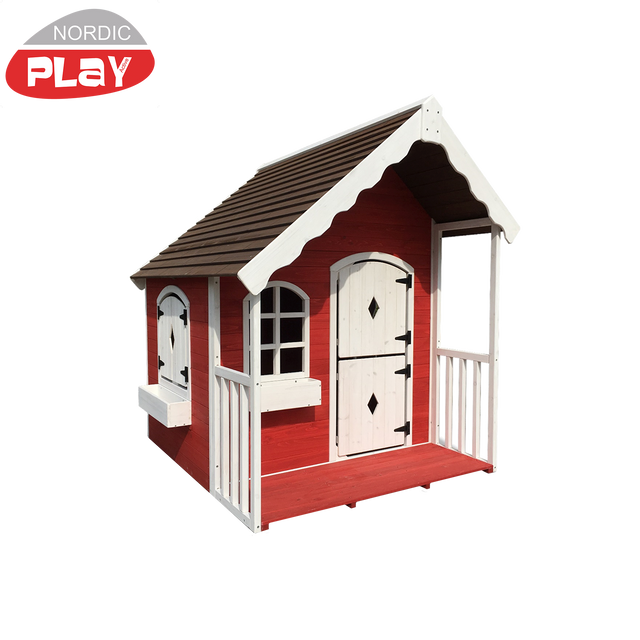NORDIC PLAY legehus fuldmalet i hvide/røde nuancer i god kvalitet i 10 mm fyrretræ. med skæve døre og vinduer. Døren har magnetlås. inkl. gulv og altankasser. Kommer delsamlet i sektioner, hvilket giver nem og hurtig samling af legehuset. Kan anvendes både indendørs og udendørs, da træbeskyttelsen er vandbaseret.