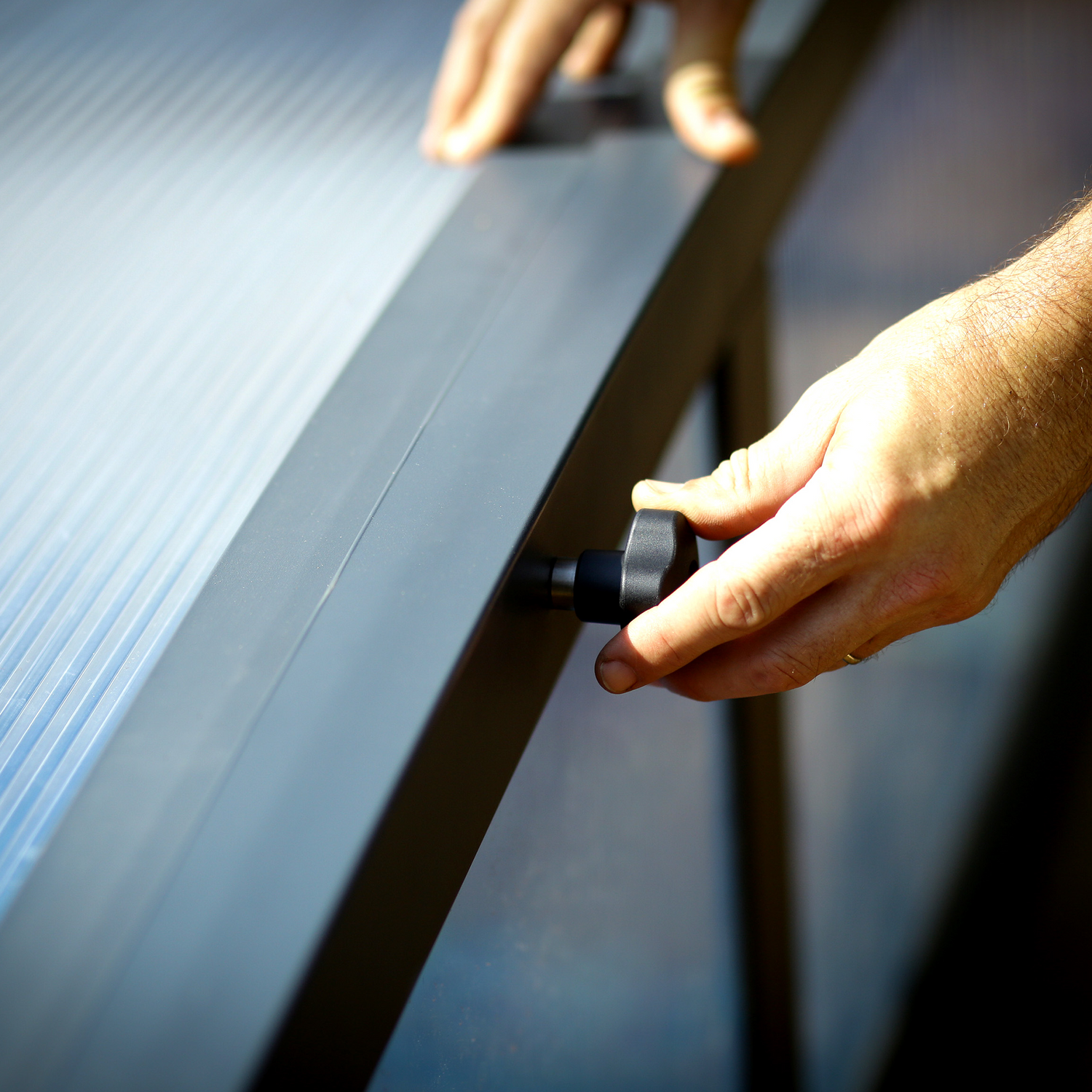 Kvalitetsmaterialer: Tåler barskt vejr med UV-beskyttede, slagfaste polycarbonatpaneler, der giver 90 % lysgennemtrængning. Pulverlakeret aluminium med Qualicoat® Qualimarine-certificering, rustfrit stål og nylonhjul sikrer holdbarhed i klorerede miljøer.