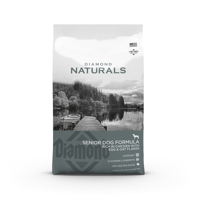 Diamond Naturals Senior Dog foder med kylling, æg og havreflager. Et komplet foder til ældre hunde. Nøje udvalgt protein og fedt for at imødekomme den ældre hunds behov. Indeholder fibre der fremmer fordøjelsen. Glukosamin og condroitin fremmer sunde led, Superfoods, selen og E-vitaminer giver gode antioxidanter.