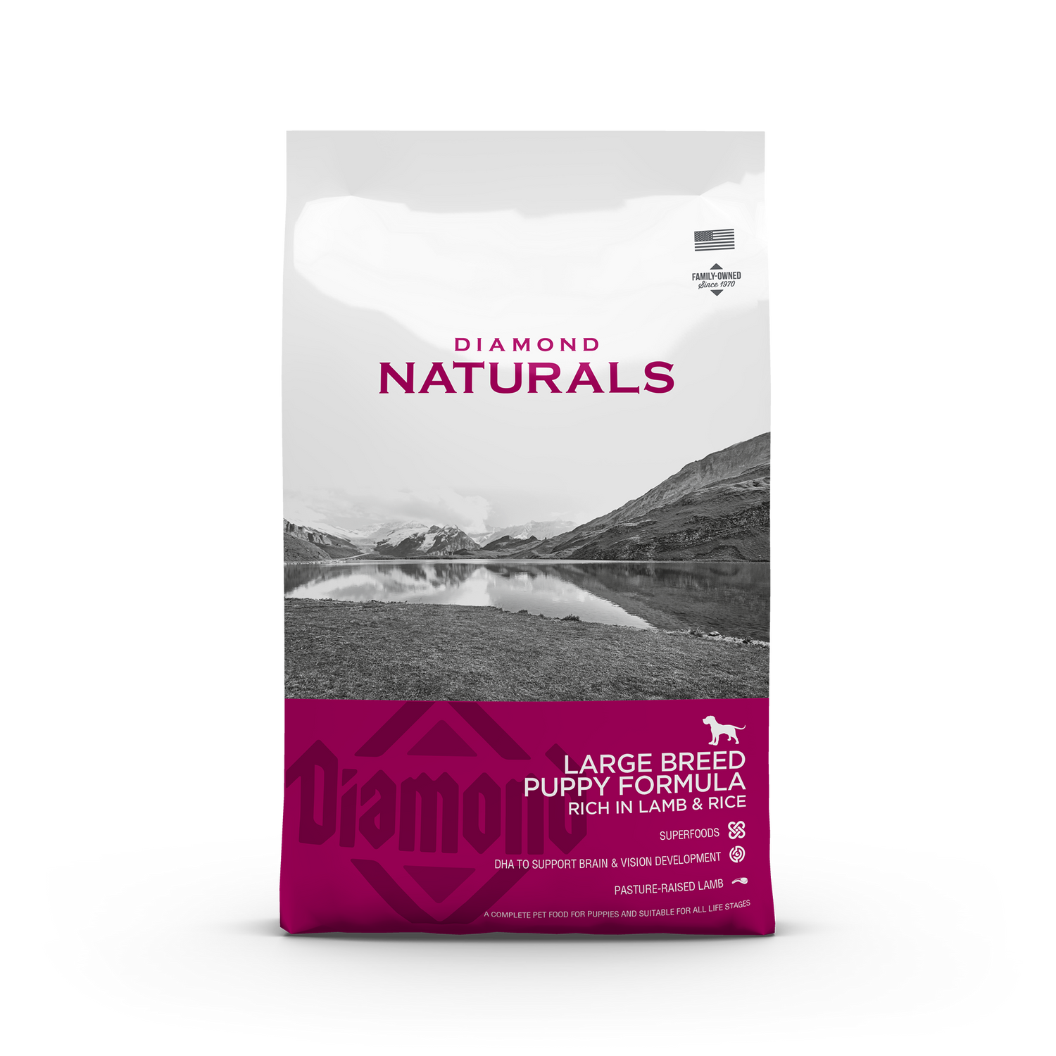 Diamond Naturals foder til hvalpe af store racer med lam og ris. Et komplet foder til hvalpe og hunde i alle livsstadier.