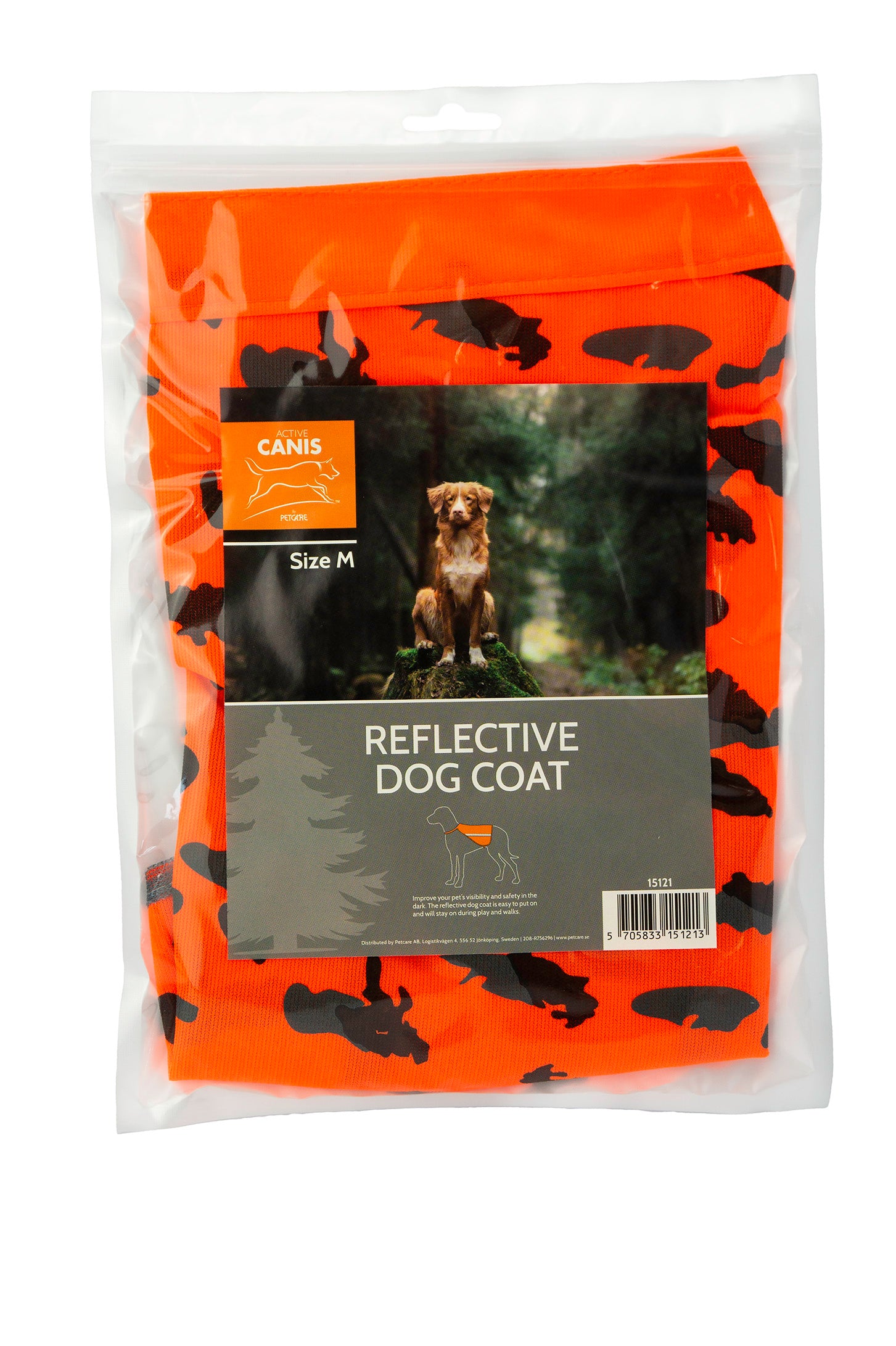 Neon orange refleksvest fra Active Canis med reflekterende striber. Lukkes med velcro rundt brystkasse og hals.