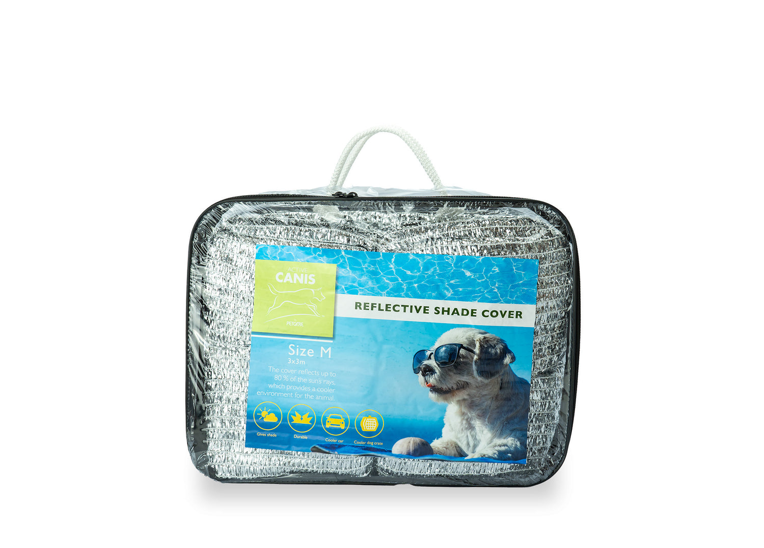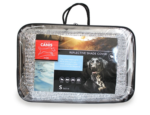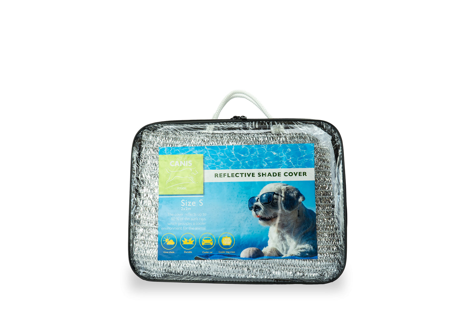 Sølvdugen reflekterer ca. 80 % af solens stråler og giver hunden en god skygge og en køligere tilværelse Kan med fordel bruges over buret eller bilen eller i haven - ja, lige hvor du har brug for det. Kommer i praktisk taske, så den er nem at medbringe og opbevare. Vejer ikke meget så de er lette at håndtere. Er lavet i et vævet materiale som giver god ventilation (HDPE) High Density Polyethylene - garn med aluminiums belægning. Der er lavet øjer i kanten som gør det let at fastgøre coveret. Fåes i 3 størrelser: S - 2x2 meter - varenr. 11681 M - 3x3 meter - varenr. 11682 L - 4x4 meter - varenr. 11683 Husk: På trods af at dugen afspejler solens stråler er det ikke acceptabelt at efterlade dit dyr uden opsyn i bilen på en varm dag.