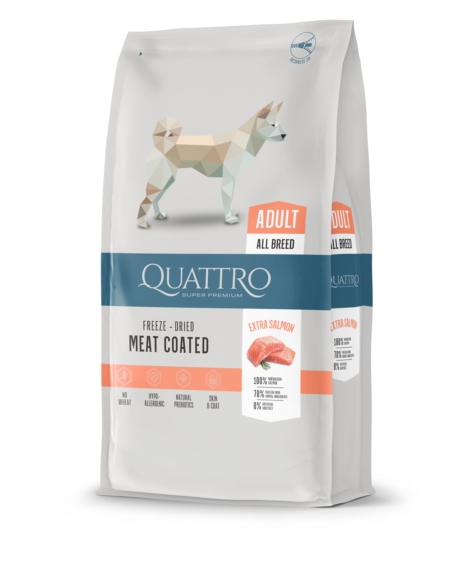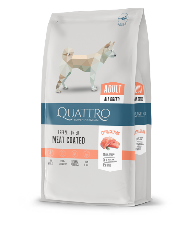 Komplet super premium foder til voksne hunde af alle racer med laks. Foderkulene i QUATTRO hundemad er dækket med frysetørret laks, hvilket bevarer den naturlige smag. Dette hundefoder vil tilfredsstille selv de mest kræsne firbenede venner.