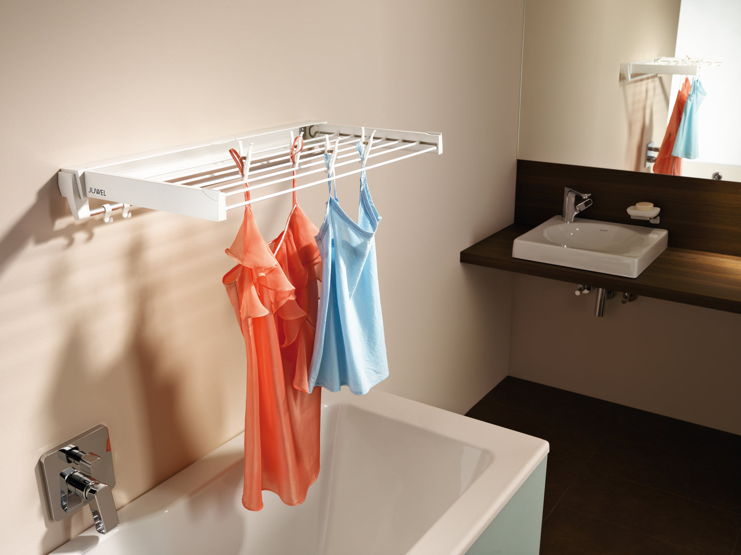 Kunsten at tørre. Dette lille diskrete og kunstneriske væghængte ARTDRY tørrestativ fra Artweger by JUWEL har en bæreevne på ca. 12 kg. Tørrestativet til montering på væggen med plastbelagte stålstænger, som smart klappes sammen efter brug. Kan bruges på selv små badeværelser, da det kun fylder 10,5 cm. i højden og 53,3 cm. i dybden i brug. Og når det ikke bruges tager det kun 6,4 cm. plads fra væggen i dybden!
