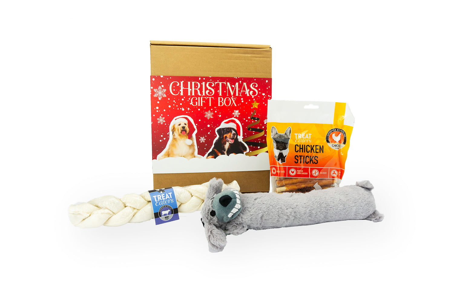 Udpak magien af sæsonen med den festlige Treateaters Christmas Gift Box, med godbidder og legetøj. Det vil blive en uforglemmelig jul for dit kæledyr! Den indeholder 3 gaver: Treateaters Chicken Sticks, Treateaters Braided Retriever og en Party Pets Party Stick.